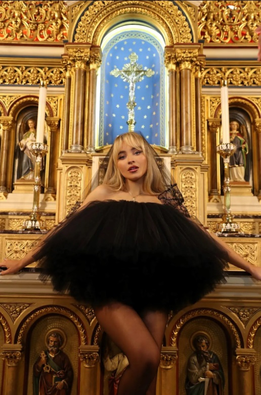 The Feather video, released last year, features Carpenter provocatively dressed at a 'funeral' for her ex-boyfriends inside Brooklyn's Annunciation of the Blessed Virgin Mary Church. The scene shows the men committing suicide, with fake blood splattering onto the singer.