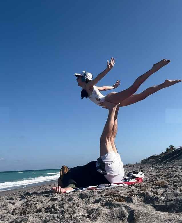 On Saturday, the 24-year-old shared photos from their outing at Jupiter Beach, where the 72-year-old coach playfully lifted her overhead.